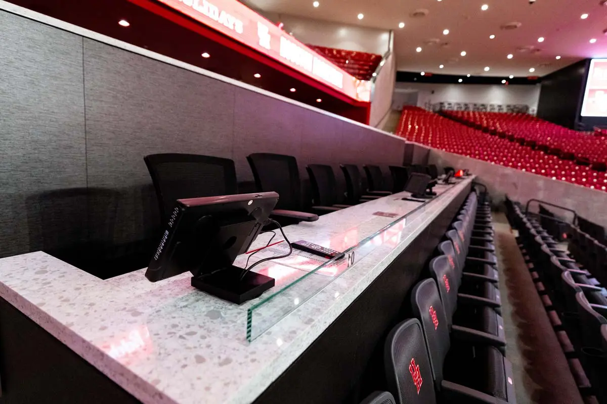 Loge Seating allows for comfort, convenience and excellent view of the court via a comfortable rolling chair and table space for food and drinks only 9 rows from court.